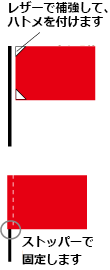 仕様に関しては通常の旗と同様に左右どちらか一辺の角に穴を開け、レザーとハトメを取り付け、紐を通して使用するタイプ。フラッグポールを棒袋に差し込み、ストッパーで固定する仕様が人気です。棒袋は左右どちらか一辺を袋状に縫製して作成されます。
